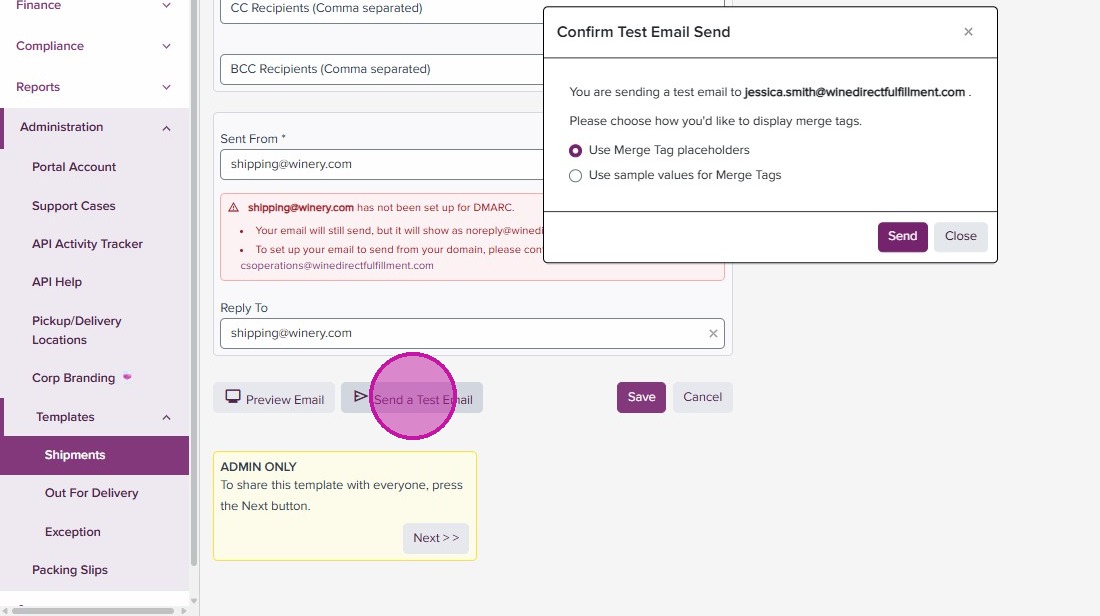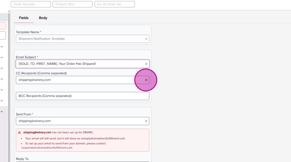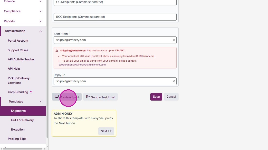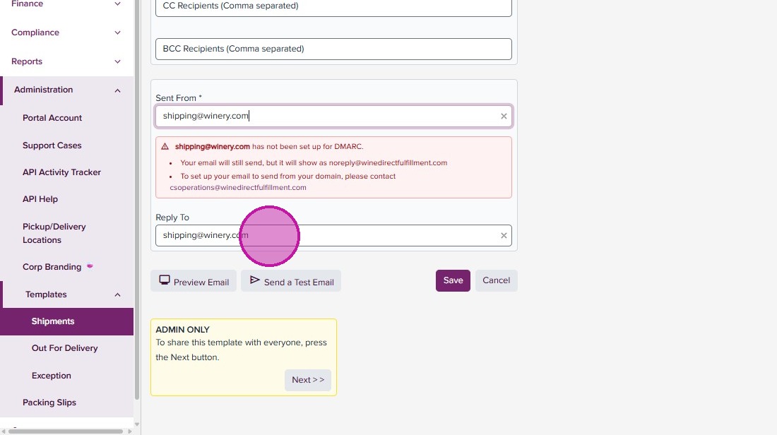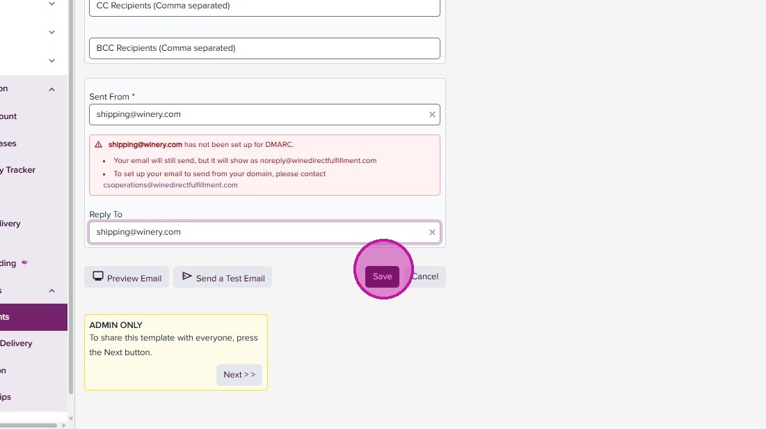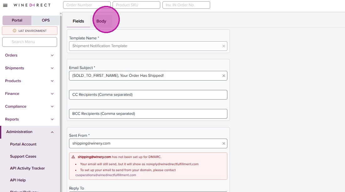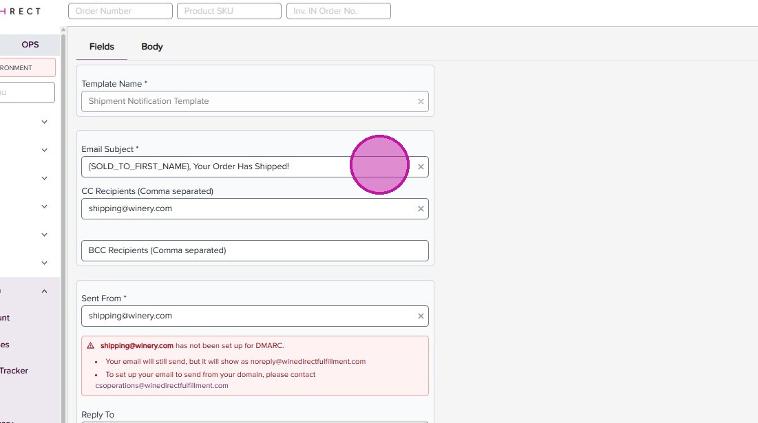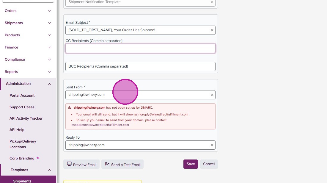 DMARC configuration allows for WineDirect Fulfillment to send emails from your domain. If this is not configured, emails will show as sent from “noreply@winedirectfulfillment.com”. To set up, ensure you or your support team has access to your company’s DNS settings and contact us at csoperations@winedirectfulfillment.com.