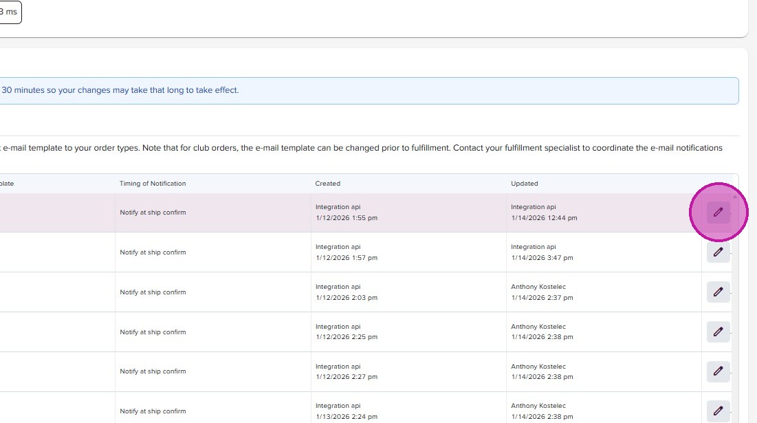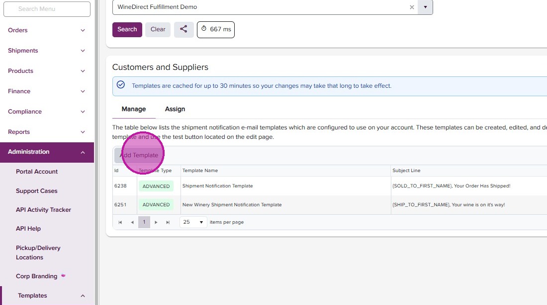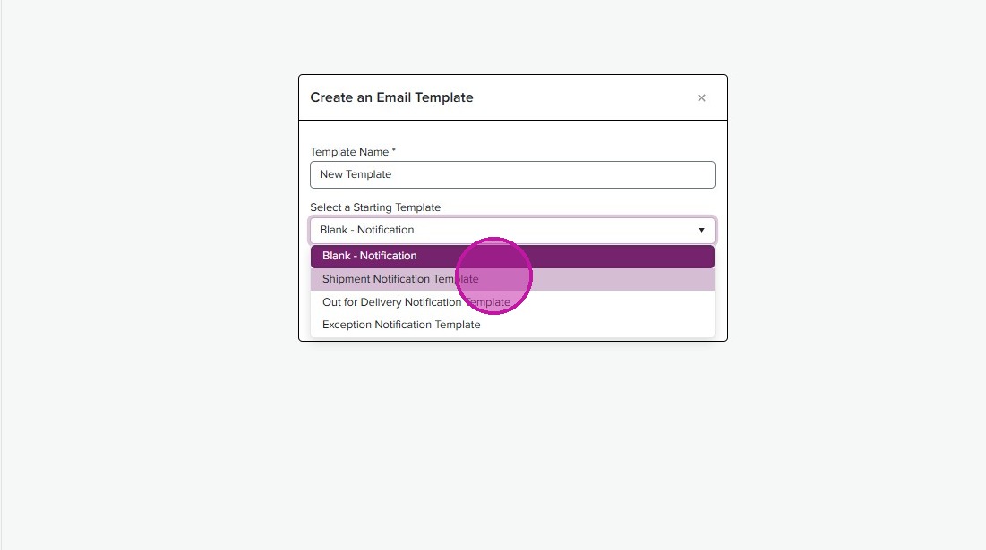 To configure a Shipment Notification, start by adding a template. Go to the Administration menu and navigate to Templates >> Shipment, then select your account from the dropdown. Here, you’ll see any tempaltes you already have on file. If none exist, click ‘Add Template.’