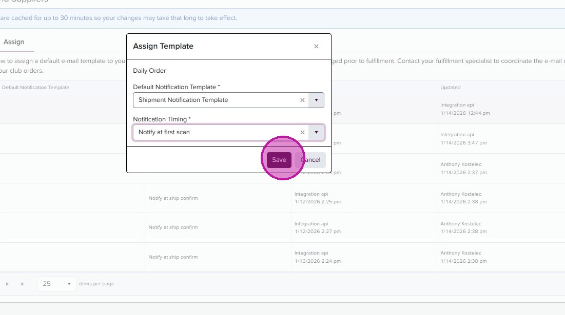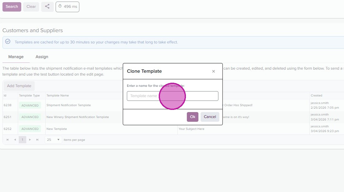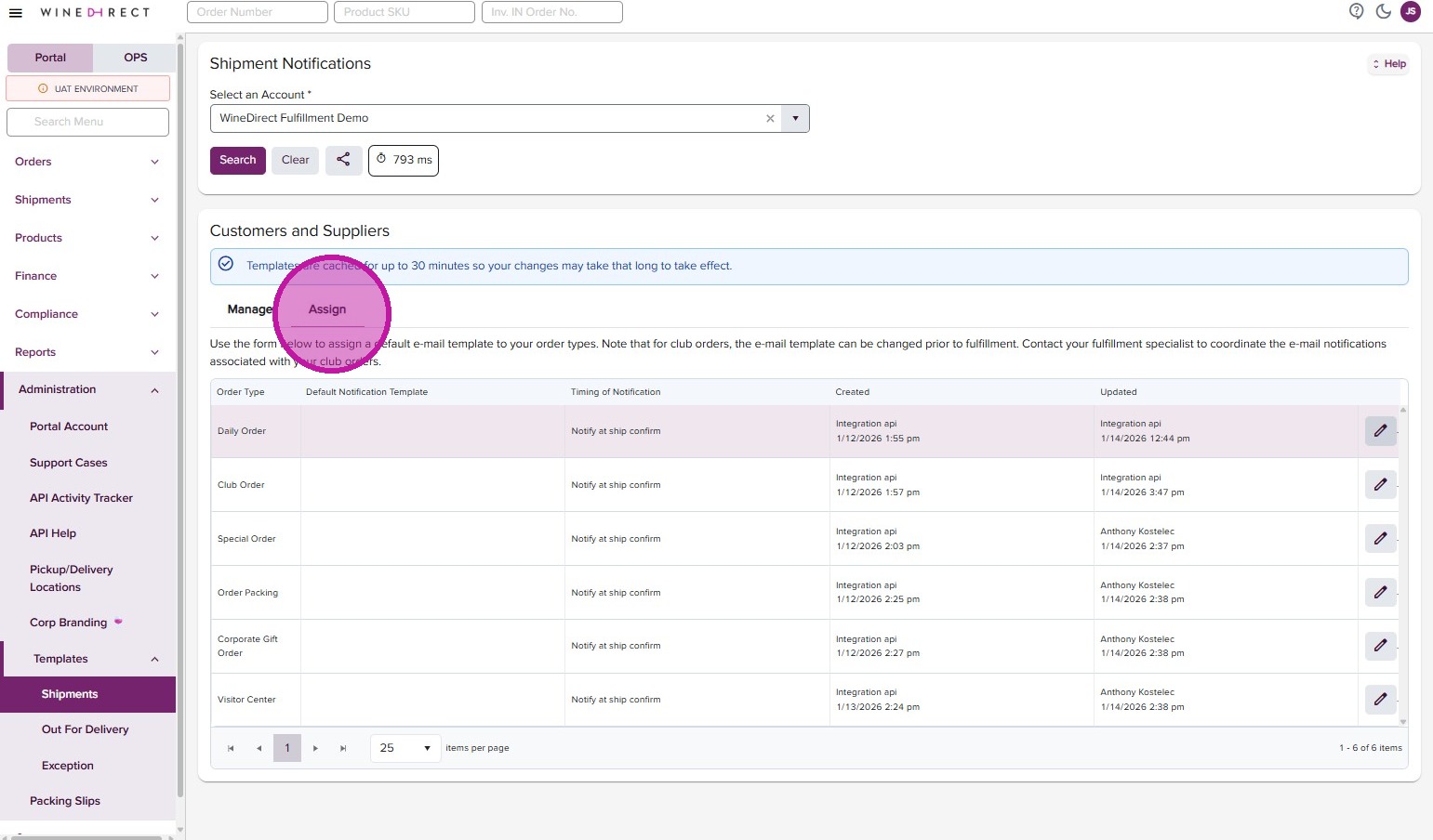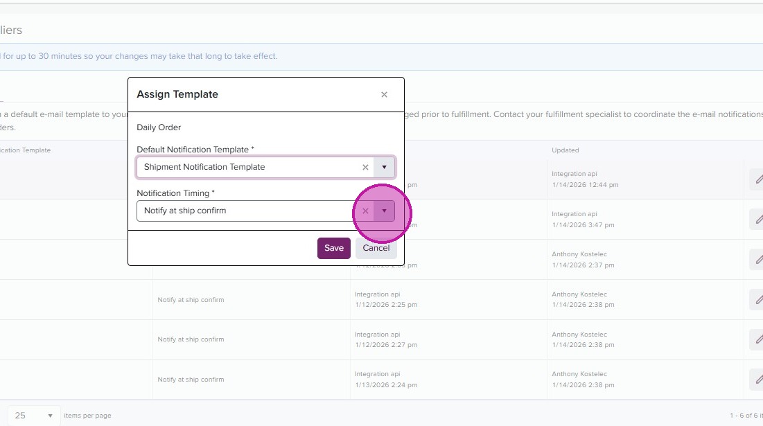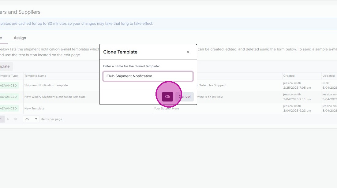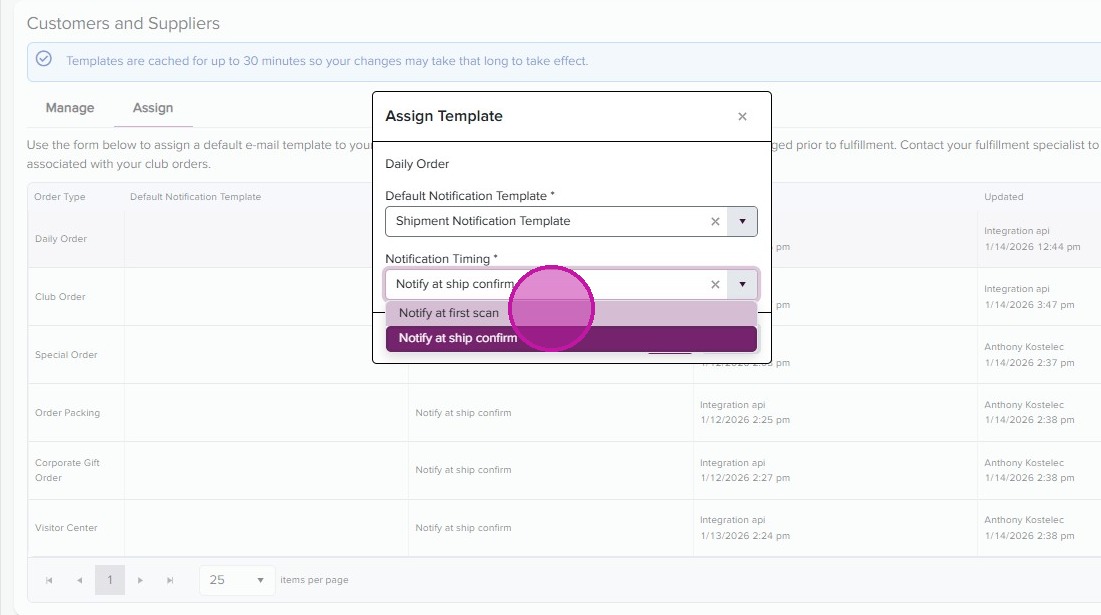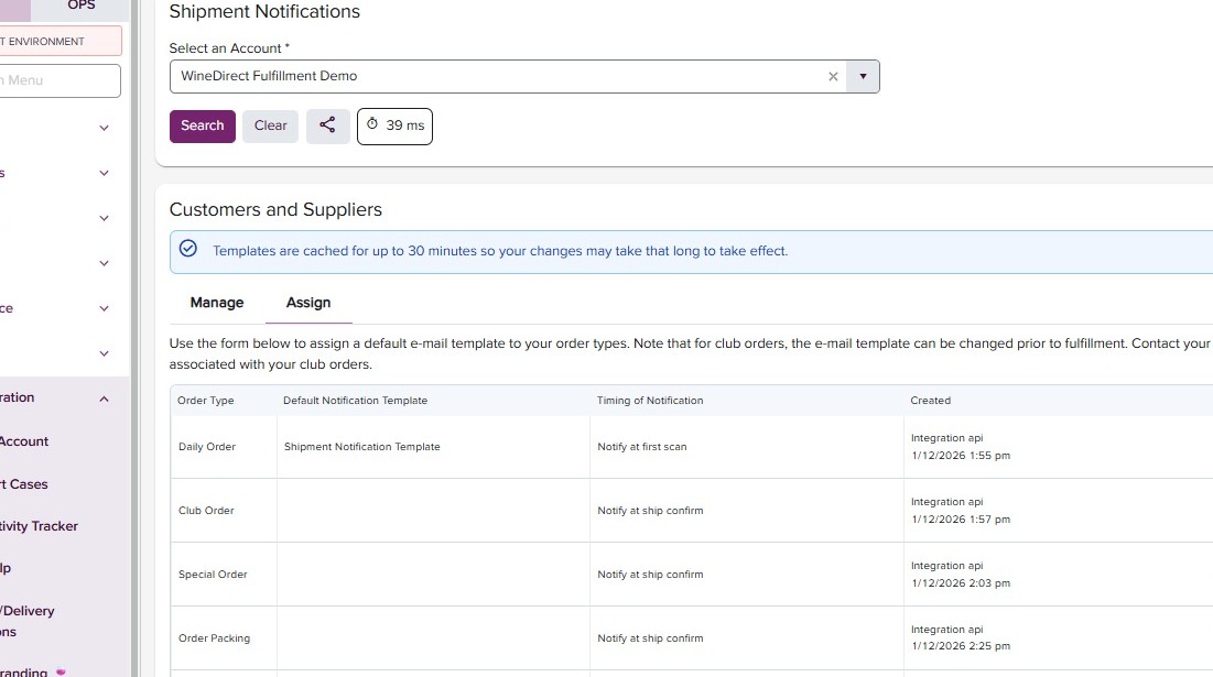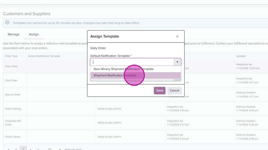 - Back in the Shipment Notification page, you can now assign your templates by order type. Click on the “Assign’ tab.