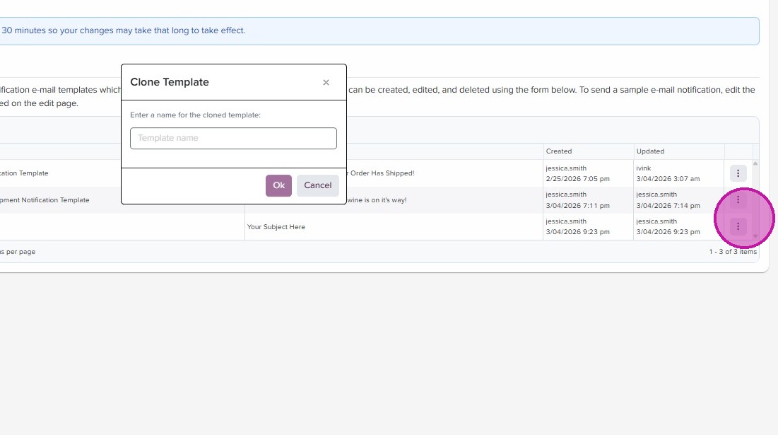 - To Clone an existing template, click on the three dots to the right.