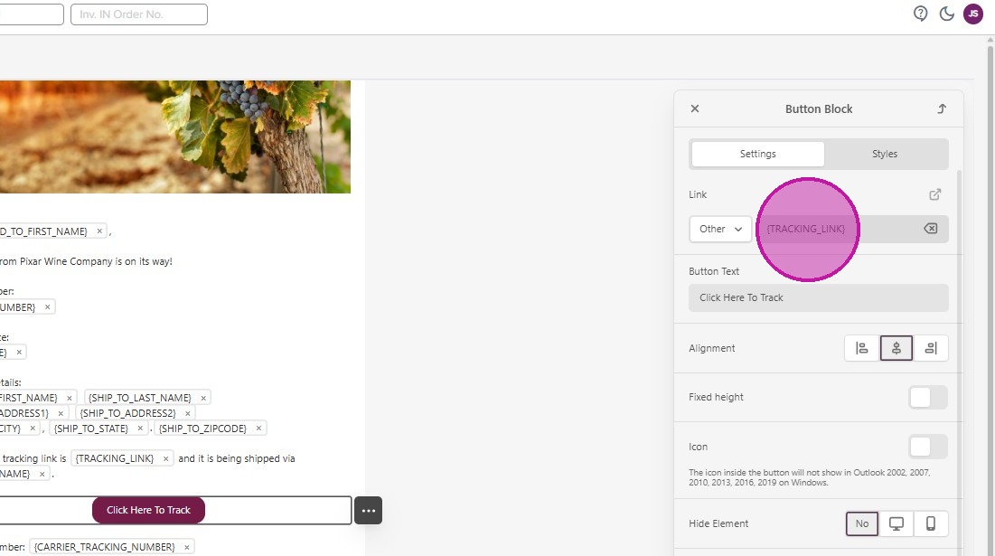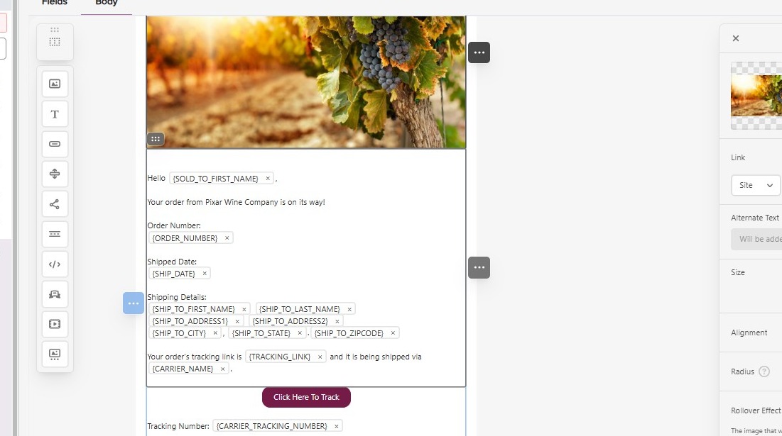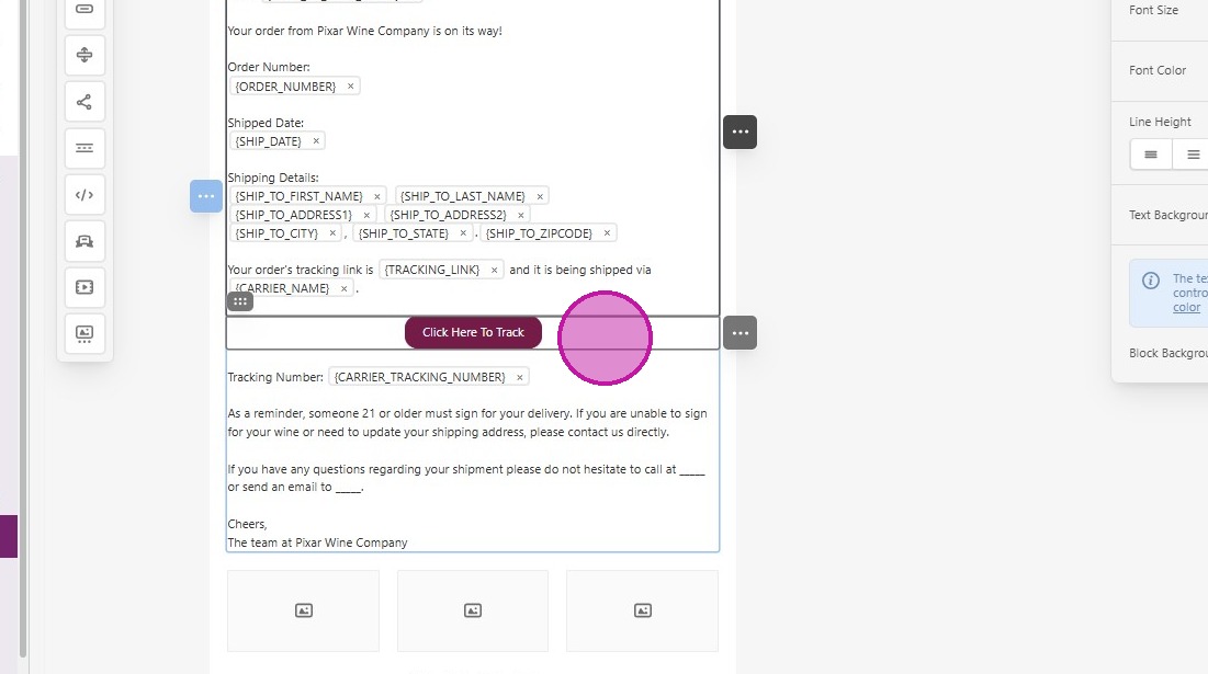 - Currently, we have the Merge Tag for ‘Tracking Link’ associated, but you can change this to any URL you’d like.