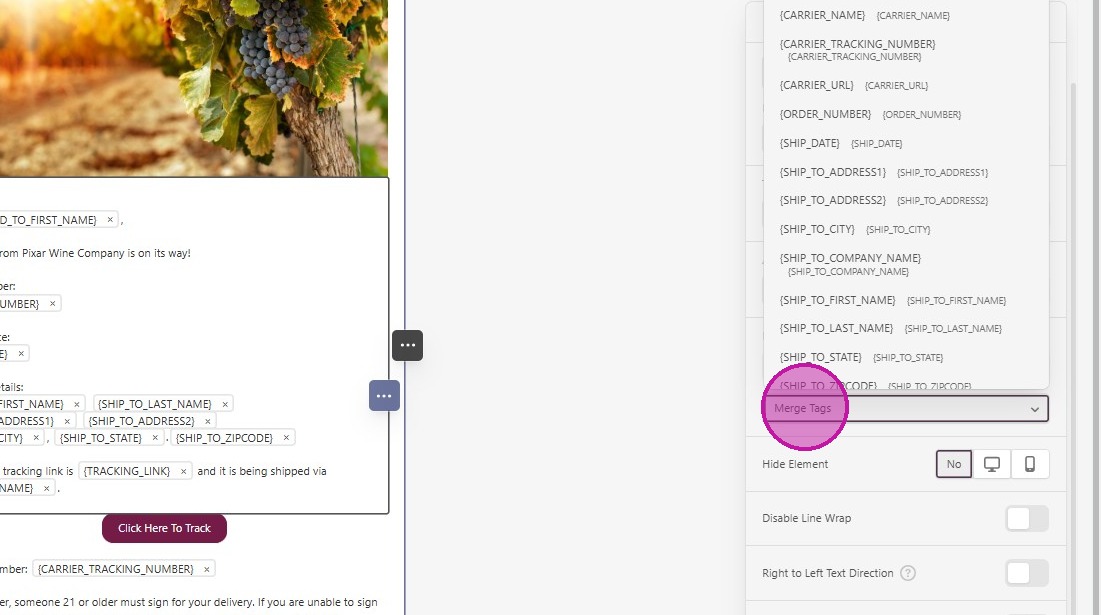 - All available Merge Tags will be in the dropdown to insert.
